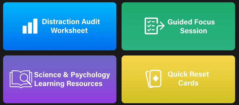 Quick Reset Cards → fast reminders you grab the second distraction pulls.